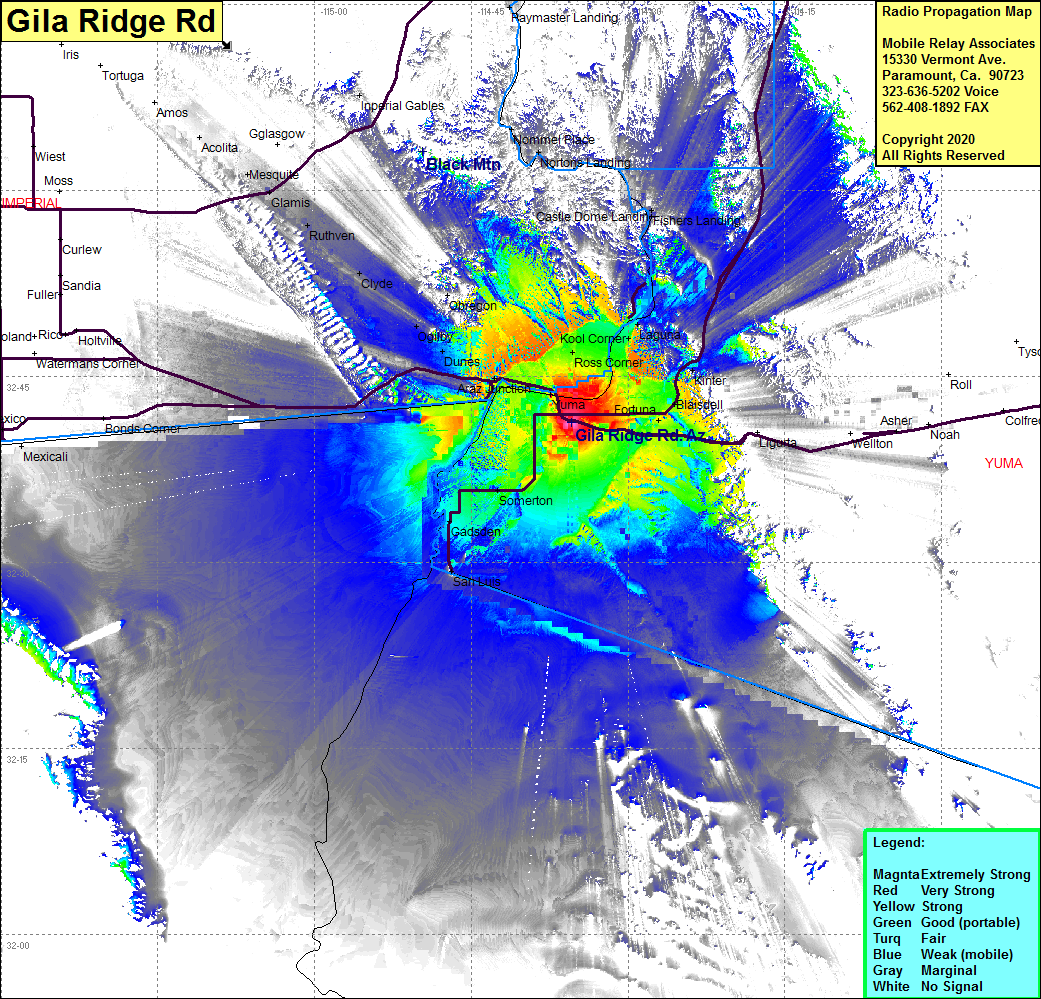 Site Coverage: Coverage of Yuma, Ross Corner, Bard, Kool Corner, Fortuna, Blaisdell, Kinfer, Laguna, Fishers Landing, Dunes, Ogilby, Clyde, Ruthven, Glamis, Mesquite, Obregon, Somerton, Gadsden, Somerton, Araz Junction, Steam, Andrade, Winterhaven, Imperial Gables, Paymaster Landing, Nommel Place, Wellton, Asher, Noah, tacna, Roll, Colfred, Owl, Mohawk, Roll, Growler, Tyson Norton