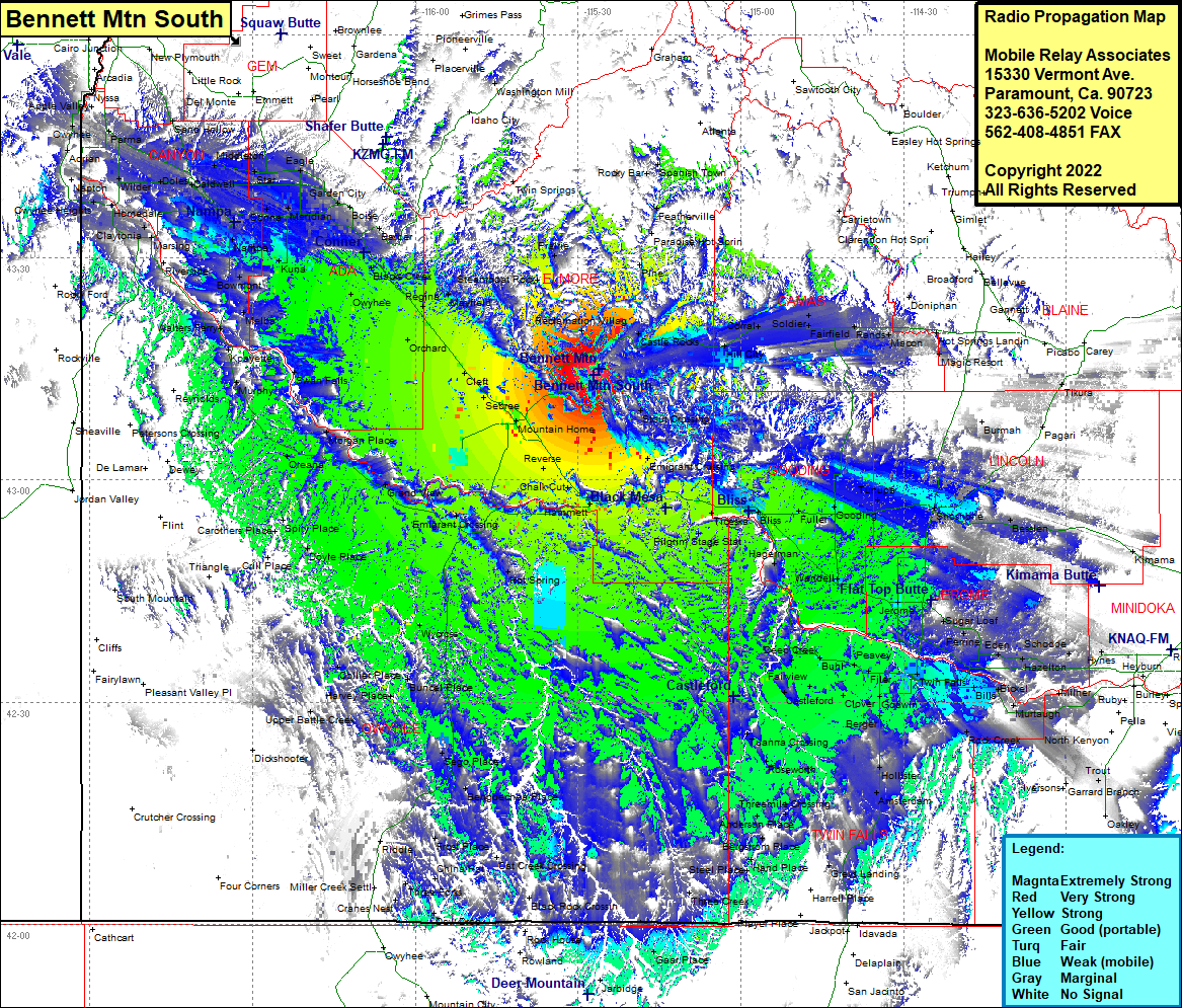 Site Coverage: Coverage of the southern half of Elmore County, most of Ada & Gooding counties, half of Owyhee County, Dixie, Windy Gap, Castle Rocks, Reclamation Village, Stout Crossing, Emigrant Crossing, Mountain Home, Reverse, Pine, Steamboat Rock, Paradise Hot Springs, Featherville, Doniphan, Soldier, Fairfield, Selby, Rands, Blaine, Macon, Hot Springs Landing, Stanton Crossing, Magic Resort, Magic City, Hill City, Corral, Gannett, Tikura, Pagari, Burmah, Bliss, Fuller, Gooding, Tunupa, Hagerman, Hydra, Jeroma, Perrine, Eden, Schodde, Hynes, Heyburn, Murtaugh, Ruby, Rock Creek, Iversons, Trout, Garrard Branch, Oakley, Hollister, Filer, Peavey, Buhl, Castleford, Clover, Fairview, Deep Creek, Tuanna Crossing, Roseworth, Threemile Crossing, May Place, Hand Place, Indian Jim Place, Meteor, Amsterdam, Hollister, Gaar Place, Pilgrim Stage Station, Hot Spring, Bruneau, Indian Cove, Chalk Cut, Reverse, Mountain Home, Emigrant Crossing, Wycross, Wickahoney Crossing, Collier Place, Cottonwood, Upper Battle Creek, Blue Creek Crossing, Sego Place, Bengoechea Place, Frost Place, Three Forks, Cranes Nest, Doyle Place, Spiry Place, Oreana, Morgan Place, Swan Falls, Murphy, Kpayette, Warrens, Melba, Westma, Walters Ferry, Sebree, Cleft, Orchard, Regina, Mayfield, Owyhee, Blacks Creek, Vernon, Boise, Eagle, Middleton, Meridian, Beatty, Middleton, Bramwell, Dolan, Wider, Napton, Parma, Adrian, Nyssa, Arcadia, Napton, Homedale, Marsing, Riverside, Givens Hot Springs