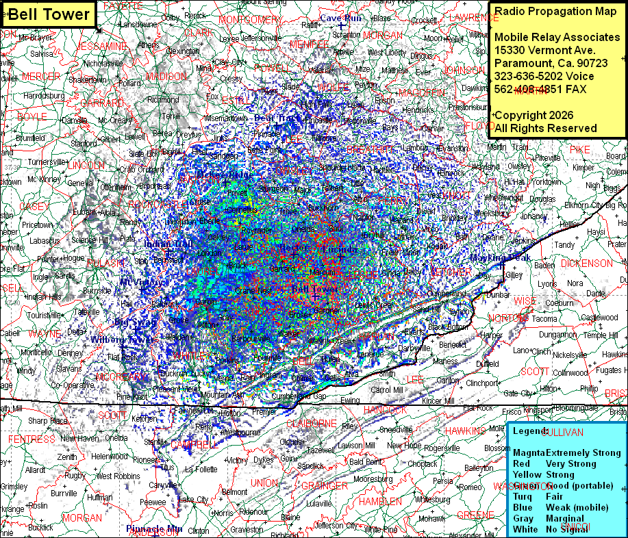 Site Coverage: Coverage of Clay, Leslie, Perry, Knox, Laurel, Owsley Counties, parts of Lee, Breathitt, Perry, Knott, Letcher, Harlan, Bell, Whitley, Pulaski, Rockcastle, Jackson, Lee Counties and a few locations within Montgomery, Moargan, Magoffin, Johnson, Floyd, Pike, Martin, McCreary, Wayne, Pulaski, Casey, Lincoln, Boyle, Jessamine, Fayette, Clark, Powell, Estill Counties plus spotty coverage in Dickenson (VA), Wise (VA), Norton (VA), Lee (VA), Hancock (TN), Hawkins (TN), Granger (TN), Union (TN), Claiborne (TN), Campbell (TN) Counties