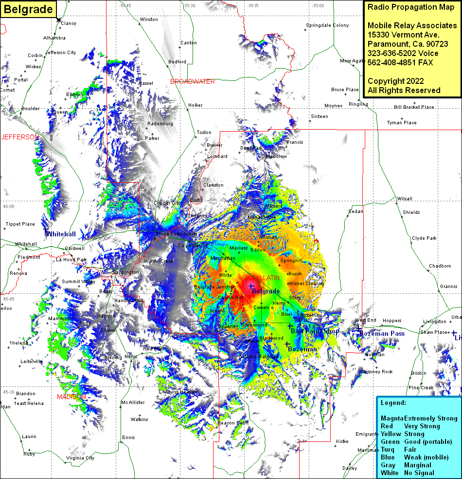 Site Coverage: Coverage of Bozeman, Catron, Story, Camona, Wisner Crossing, Busch, Springhill, Cowan, Kems, West Gallatin, Holland, Patterson, Belgrade, Amsterdam, Buell, White, Manhattan, Macless, Edilou, Hillman, Manhattan, Menard Wye, Menard, Logan, Carpenter, Three Forks Junction, Atkins, Gallatin Gateway, West End, Muir, Sappington, Shaws, Sterling, Harrison, Beals, Summit Valley, Sterling, Pony, Copper City, Lombard, Parker, Radersburb, Maudlow