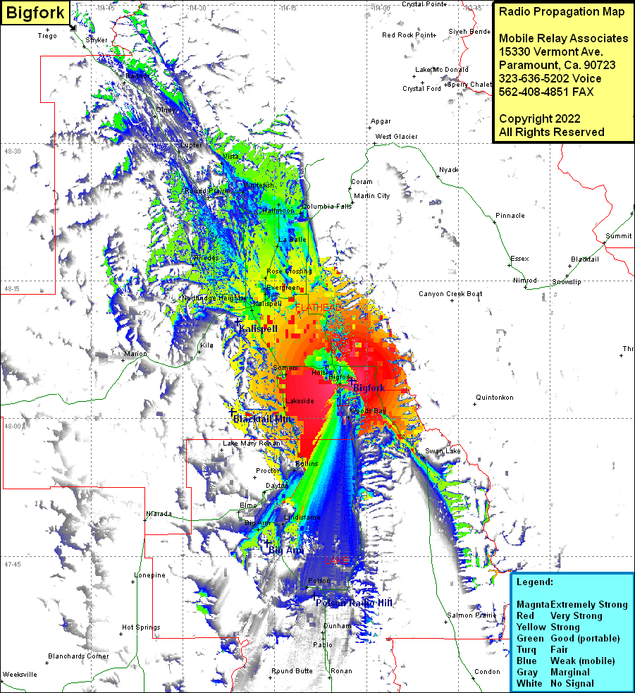 Site Coverage: Coverage of Montana Highway 83 from Montana Highway 35 heading east and south past Swan Lake for several miles, Montana Highway 35 heading south from Highway 82 along Flathead Lake to Polson, Lakeside, Rolling, Elmo, Big Arm, Lindisfarne, Polson, Dunham, Pablo, Holt, Somers, Kalispell, Northridge Heights, Evergreen, Rose Crossing, La Salle, Kila, Rhodes, Marion, Halfmoon, Whitefish, Round Prairie, Vista, Lupfer, Olney, Radnor