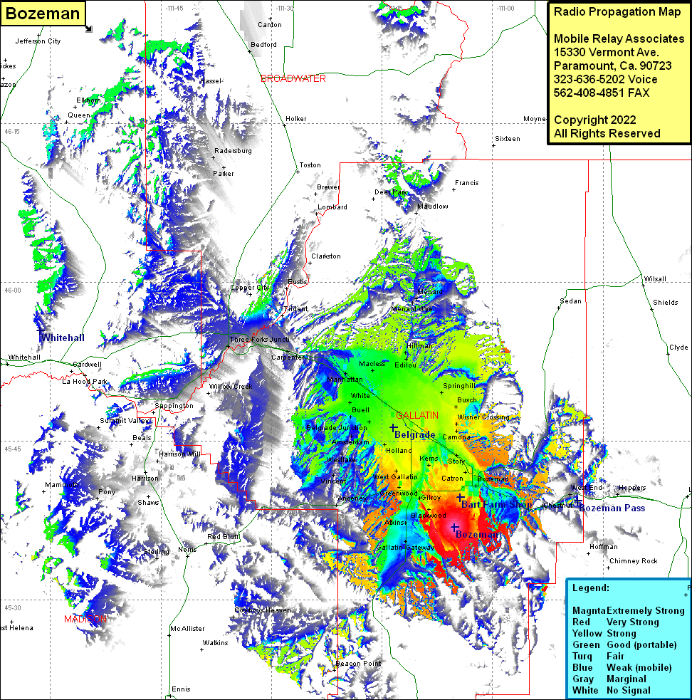 Site Coverage: Coverage of Matthews, Patteson, Bozeman, Catron, Bisel, Story, Camona, Wisner Crossing, Busch, Chestnut, West End, Galletin Gateway, Beacon Point, Atkins, Blackwood, Gilroy, Greenwood, West Gallatin, Kems, Cowan, Anceney, Vincent, Arnold, Westlake, Amsterdam, Belgrade Junction, Buell, Church Hills, Holland, White, Balmont, Edilou, Hillman, Accola, Menard Wye, Menard, Macless, Manhattan, Logan, Carpenter, Three Forks Junction, Lombard, Clarkston, Parker, Radensburg