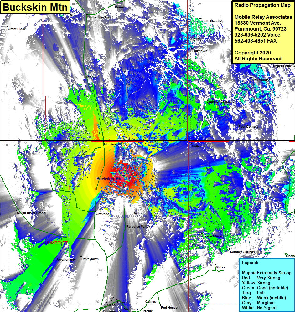 Site Coverage: Coverage of the northeastern portion of Humboldt County, the northwest portion of Elko County, the southeast portion of OregonCounty, the southwest portion of Idaho County, US Hwy 95 from north of the junction of Nevada Hwy 140 to Oregon Hwy 78 where US 95 turns east continuing with intermittant coverage for many miles, McDermott, Awakening, Daveytown, Paradise Valley, Castle Place, Cathcart, Four Corners, Fairylawn, Cliffs, Burns Junction, Basque