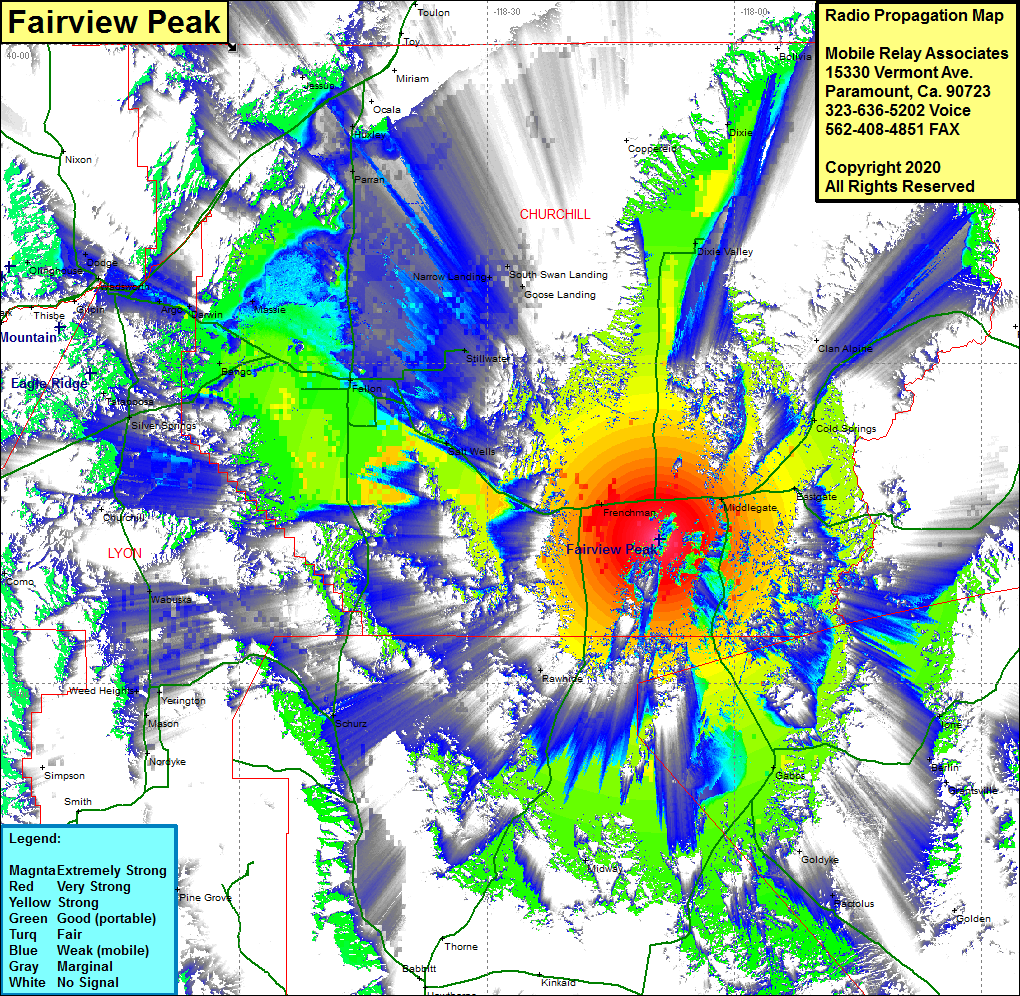 Site Coverage: Coverage of the southcentral portion of Churchill County, Frenchman, Middlegate, Eastgate, Cold Springs, Dixie Valley, South Swan Landing, Narrow Landing, Peers Landing, Stillwater, Salt Wells, Massie, Bango, Wabuska, Yerington, Schurz, Talapoosa, Darwin, Parran, Huxley, Cold Springs, Gabbs, Pactolus