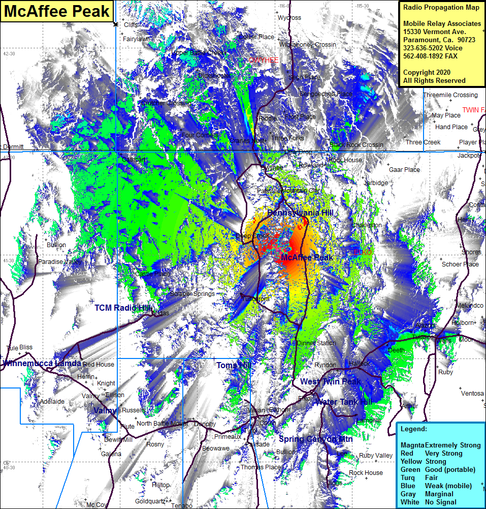 Site Coverage: Coverage of the northwest portion of Elko County, Patsville, Mounain City, Wild Horse Crossing, Deep Creek, Tuscarora, Dinner Station, Rowland, Dew Drop, Rock House, Owyhee, Cathcart, Scraper Springs, Elko, Coin, Osino, Ryndon, Hunter, Elkhorn, Carlin, Rixies, Riddle, Frost Place, Three Forks, Sego Place, Black Rock Crossing, Four Corners, Nevada Highway 225 from 10 miles north of Elko to 35 miles north of the Elko County border