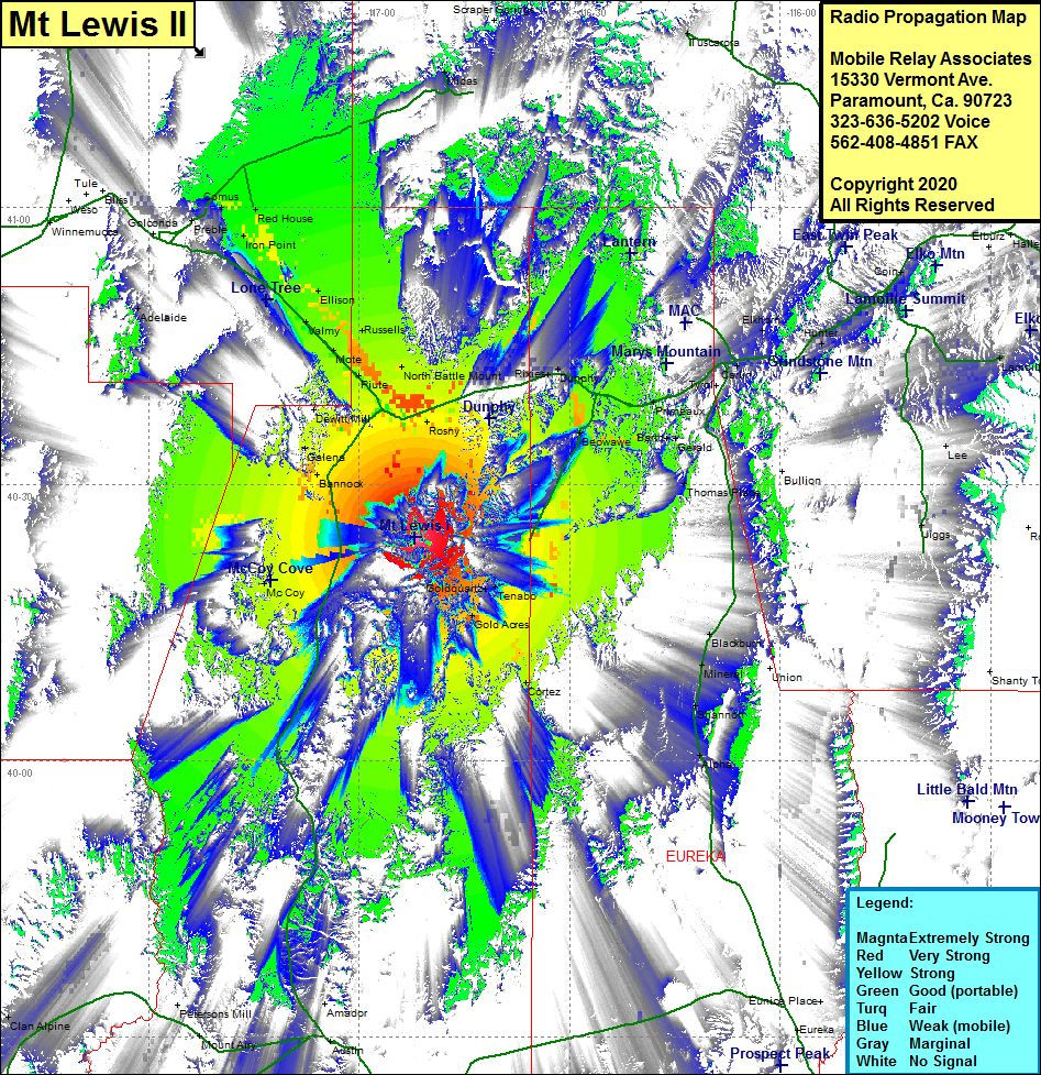 Site Coverage: Coverage of the northern portion of Lander County, Bannock, McCoy, Copper Basin, Battle Mountain, Rennox, Piute, Mote, Russells, Valmy, Ellison, Knight, Herrin, Iron Point, Red House, Comus, Kampos, Rixies, Dunphy, Beowave, Gold Acres, Tenabo, Cortez, Blackburn, Mineral, Shannon, Alpha, Cluro, Primeaux, Carlin, Vivian, Moleen, Hunter, Nevada Highway 305 from US Highway 50 just outside of Austin to Battle Mountain at the junction of Interstate 80 (Nevada Highway 304), Interstate 80 heading northwest from Battle Montain for 30 miles and most of the highway while heading west for 30 miles to Elko