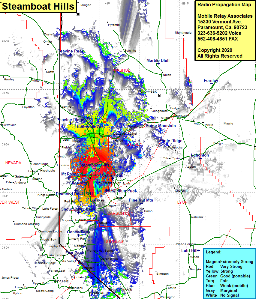 Site Coverage: Coverage of the southern portion of Washoe County, portions of Carson City County and Douglas County, Reno, Sparks, West Reno, Greenbrae School, Raleigh Heights, Black Springs, Martin, Vista, Hafed, Mustang, Washoe City, New Washoe City, Franktown, Lakeview, Carson Hot Springs, Carson City, Stewart, Genoa, Walleys Hot Spring, Buckeye, Mottsville, Sheridan, Centerville, Dresslerville, Frederickburg