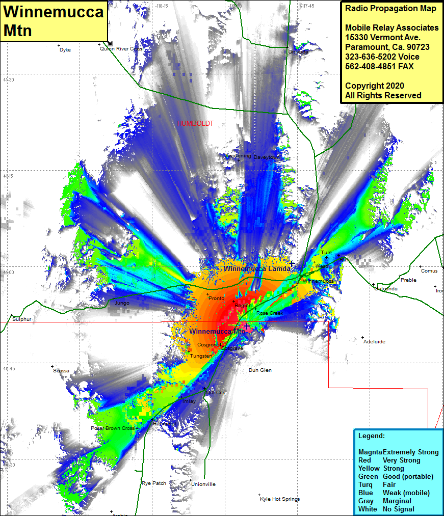 Site Coverage: Coverage of the northcentral portion of Pershing County and the southcentral portion of Humboldt County, Winnemucca, Weso, Tule, Bliss, Jungo, Pronto, Raglan, Rose Creek, Cosgrove, Cosgrave, Tungsten, Dun Glen, Mill City, Imlay, Humboldt, Poker Brown Crossing, Unionville, Awakening, Daveytown, Paradise Valley, Interstate 80 from Humboldt heading northeast to Winnemucca and Nevada Highway 49 from 40 miles west of Winnemucca to Winemucca