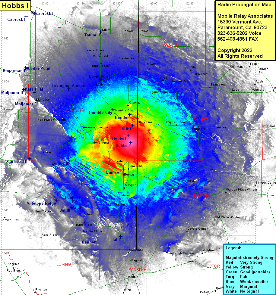 Site Coverage: Coverage of Knowles, Higginbotham, Norton, Allred, Denver City, Sligo, Pleasant Hill, Seagraves, Loop, Ashmore, Adair, Foster, Wellman, Lahey, Tokio, Brownfield, Gomez, Johnson, Plains, Bronco, Johnson, State Line, Paynes Corner, Jones City, Frankel City, Florey, Waldon Place WIndmill, Sixteen Corner Windmill, Old Place Windmill, Coyote Corner, Notrees, Magwalt, Vesrue, Kermit, North Cowden, Turnbaugh Corner, Goldsmith, Warren, Monument, Oil Center, Eunice, Maypens, Johnson, Teague, Halfway, Cotton Place, Ochoa, Baird Place, Medlin, Place, Bennett, Jal, Andrews Place, Rose Place, Loving, Malaga, Arkansas Junction, Air Base City, Humble City, Hobbs, Dora, Pen Place Windmill, Maljamar, Lovington, Hillburn City, Prairieview, McDonald, Preveler Place, Tatum, Gladiola, Loco Hills