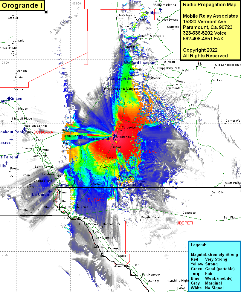 Site Coverage: Coverage of Turquoise, Old Wright Place, Valmont, Omee, Alamogordo, La Luz, Kearney, Tularosa, Apache, Carrizo, Whitetail, Cloudcroft, Avis, Orogrande, Luis Lopez, Elwood, Desert, Alavarado, Newman, Del Norte Acres, Sunrise Acres, Planeport, Aero Vista, Cielo Vista, Horizon City, Ysleta, Belen, Socorro, Buford, San Jose, El Paso, Cuidad Juarez, Nuway, Vinton, La Union, Ojito, Strauss, Mastodon, Vevay, Lanark, Rutter, Afton, Noria, Potrillo, White Sands, Boyd, Point of Sands, US HIghway 54 from Juarez to Tularosa, US Highway 70 from US Highway 54 to Organ
