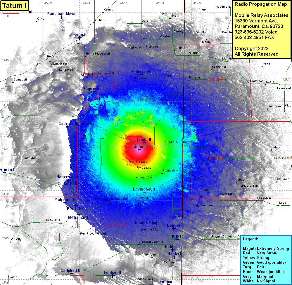 Site Coverage: Coverage of Tatum, Gladiola, Bronco, Johnson, Sundown, Lockettville, Coble, Whiteface, Morton, Famuliner, Bledsoe, Bluit, Milnesand, Crossroads, Highway, Pep, Richland, Garrison, Lingo, Griffith, Causey, Dora, Robers, Inez, Stegall, Goodland, Maple, McDonald, Hillburn, Prairieview, Norton, Plains, Allred, Denver City, Sligo, Pleasant Hill, Seagraves, Wellman, Gomez, Seminole, Paynes Corner, State Line, Knowles, Humble City, Air Base City, Hobbs, Monument, Warren, Oil Center, Jones City, Eunice, Peveler Place, Lovington, Buckeye, Arkansas Junction, Halfway, Pen Place WIndmill, Dora, Loco Hills, South Mill, Mossman, Caprock, Milnesand, Corner Well, Vest Wells, Home Place Well, Lone Wolf, Robertson Wells, Beatty Wells, Boaz, Elkins, Campbell, Tomero