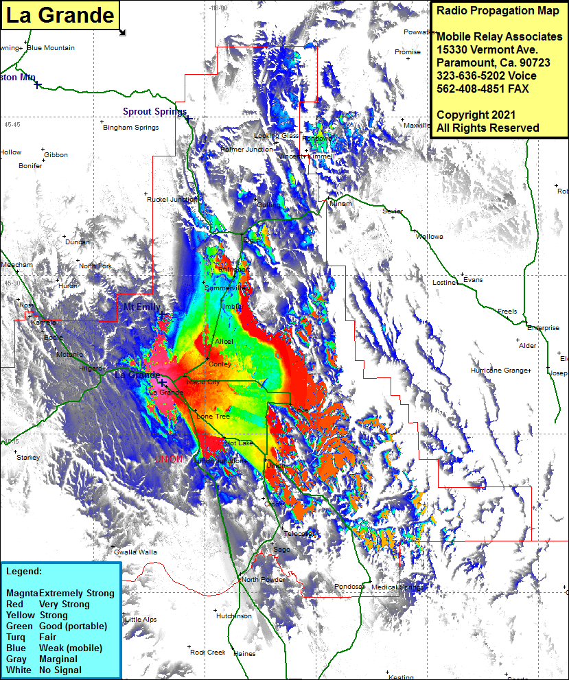 Site Coverage: Coverage of La Grande, Lone Tree, Hot Lake, Union, Cove, Island City, Conley, Alicel, Imbler, Summerville, Rhinehart, Elgin, Gulling, Hilgard, Motanic, Bodie, Kamela, Ross, Meacham, Camp Elkanah, Little Alps, North Powder, Sago, Telecaset, Crooks