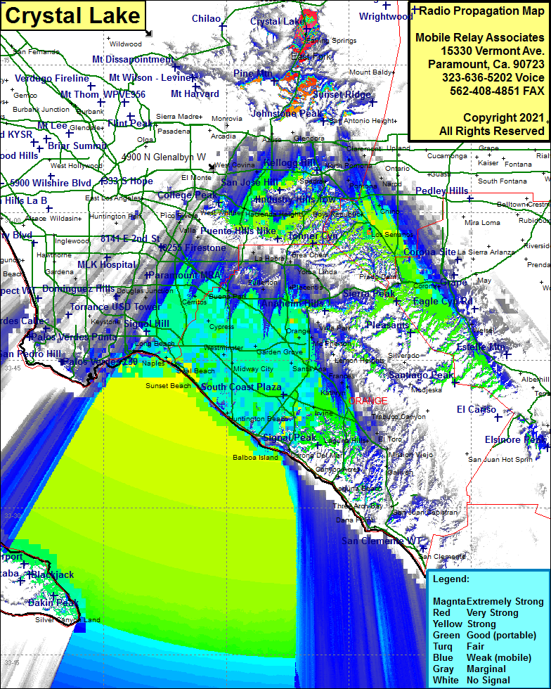 Site Coverage: Coverage of Highway 39 from Azusa to Angeles Crest Highway, Bassett, South El Monte, West Covina, Covina, Charter Oak, San Dimas, La Verne, North Pomona, Pomona, Diamond Bar, Rowland Heights, Hacienda Heights, La Puente, Bassett, Baldwin Park, Narod, Claremont, Chino, Los Serranos, Prado Dam, Corona, Weisel, Sleepy Hollow, Artesia, Cerritos, Bellflower, Lakewood, Hawaiian Gardens, Cypress, Hansen, Los Alamitos, Stanton, Garden Grove, Orange, Anaheim, Santa Ana, Tustin, Founain Valley, Midway City, Sunset Beach, Seal Beach, Los Altos, Bellmont Shore, Long Beach, Irvine, Costa Mesa, El Toro, Frances, Newport Beach
