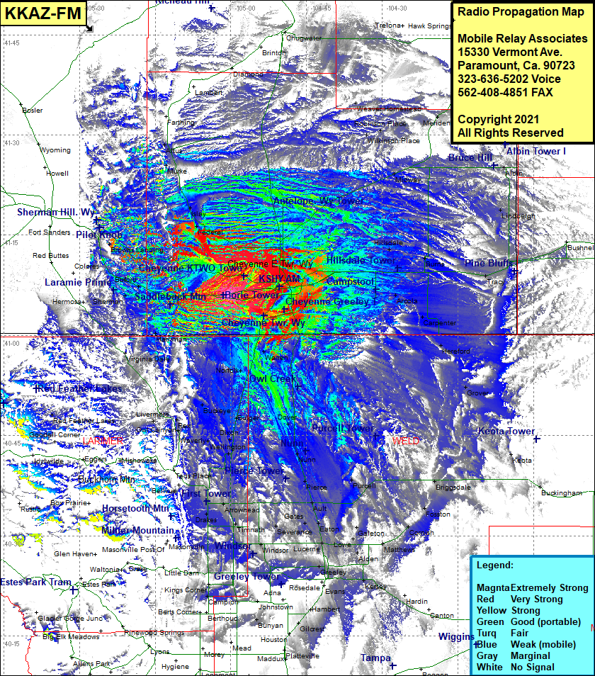 Site Coverage: Coverage of the southern portion of Laramie County, the northern portion of Weld County and Larimer County, Cheyenne, Archer, Durham, Altvan, Wilkinson Place, Weaver Homestead, Robinson Place, Midway, Meriden, Tremain, Albin, Lindbergh, Pine Bluffs, Robert, Tracy, Egbert, Burns, Arcola, Carpenter, Hillsdale, Hereford, Grover, Keota, Briggsdale, Fosston, Cornish, Matthews, Gill, Alden, Kersey, Kuner, Hardin, Augurn, East La Salle, Greeley, Farmers, Greeley Junction, Cloverly, Lucerne, Mason Corner, Comer, Johnstown, Browns Corner, Redmond, Herns, Timnath, Fort Collins, McClellends, Omeg, Drakes, Boettcher, Meyers Corner, Kenyon Corner, Giddings, Arrowhead, Black Hollow Jct, Owl Canyon, Rex, Livermore, Athol, Gleason, Orchard Valley, Warren, Rockport, Norfolk, Dover, Nunn, Pierce, Stage, Ault, Purcell, Bulger, Dixon, Wellington, Waverly, Buckeye, Harriman, Buford, Vedauwoo Glen, Hirsig, Shellback, Browns Landing, Federal, Islay, Murker, Altos