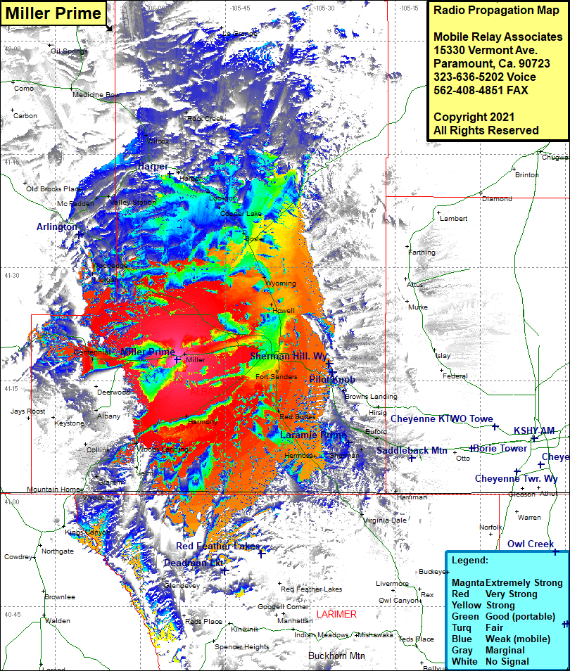 Site Coverage: Coverage of Miller, Laramie, Fort Sanders, Browns Landing, Hirsig, Vedauwoo Glen, Hermosa, Tie Siding, Red Buttes, Fort Sanders, Harmony, Woods Landing, New Jelm, Jelm, Glendevey, Foxpark, Collins, Albany, Centennial, Mountain Home, Morgan, Wooddedge, McFadden, Valley Station, WIlcox, Rock River, Rock Creek, Harper, Lookout, Cooper Lake, Bosler, Wyoming, Howell